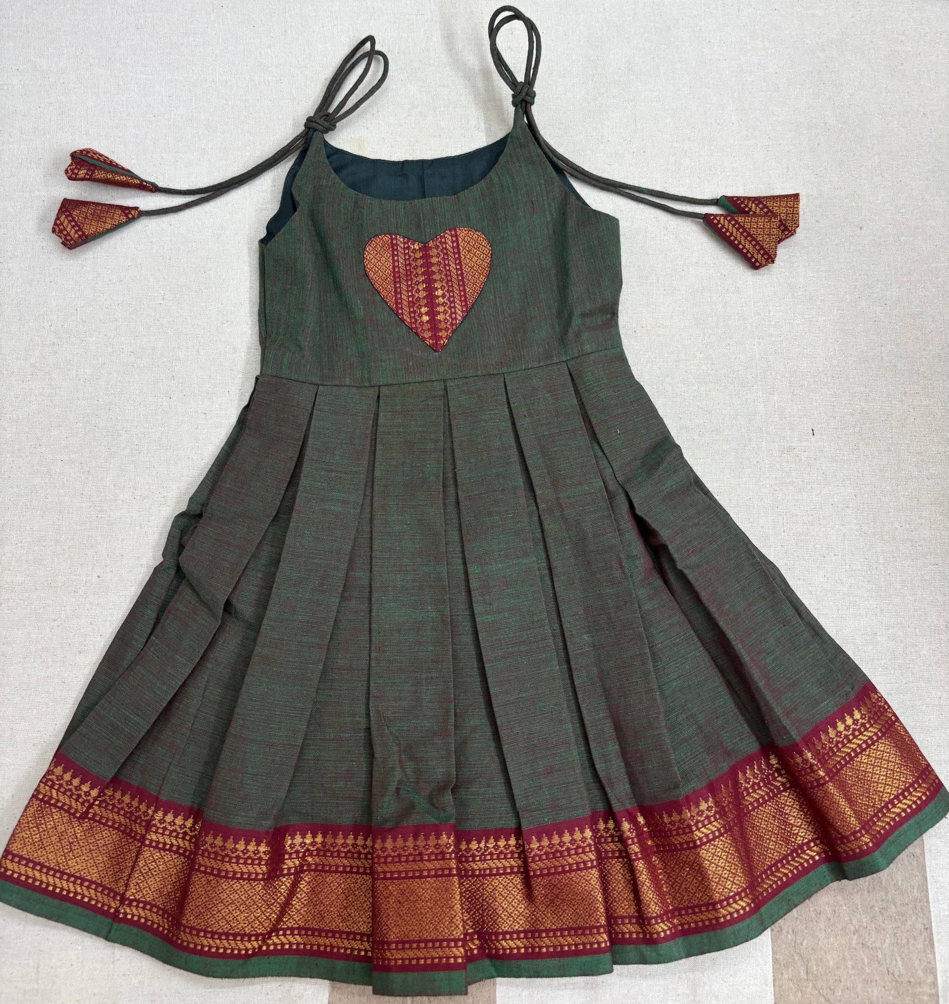 This Green Mangalagiri frock features a tie-up design and box pleats for a comfortable fit.