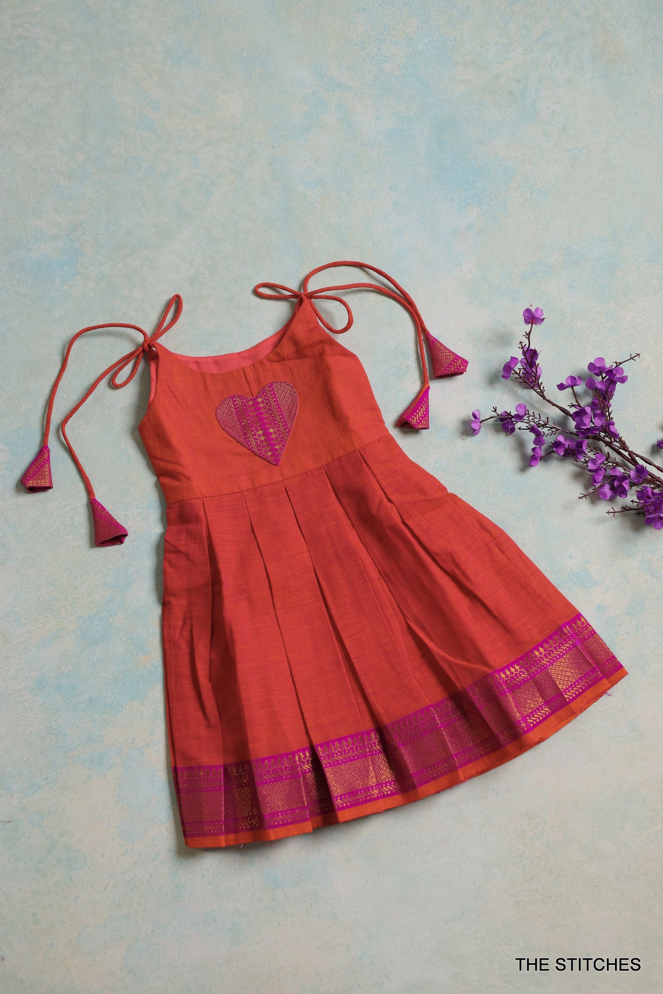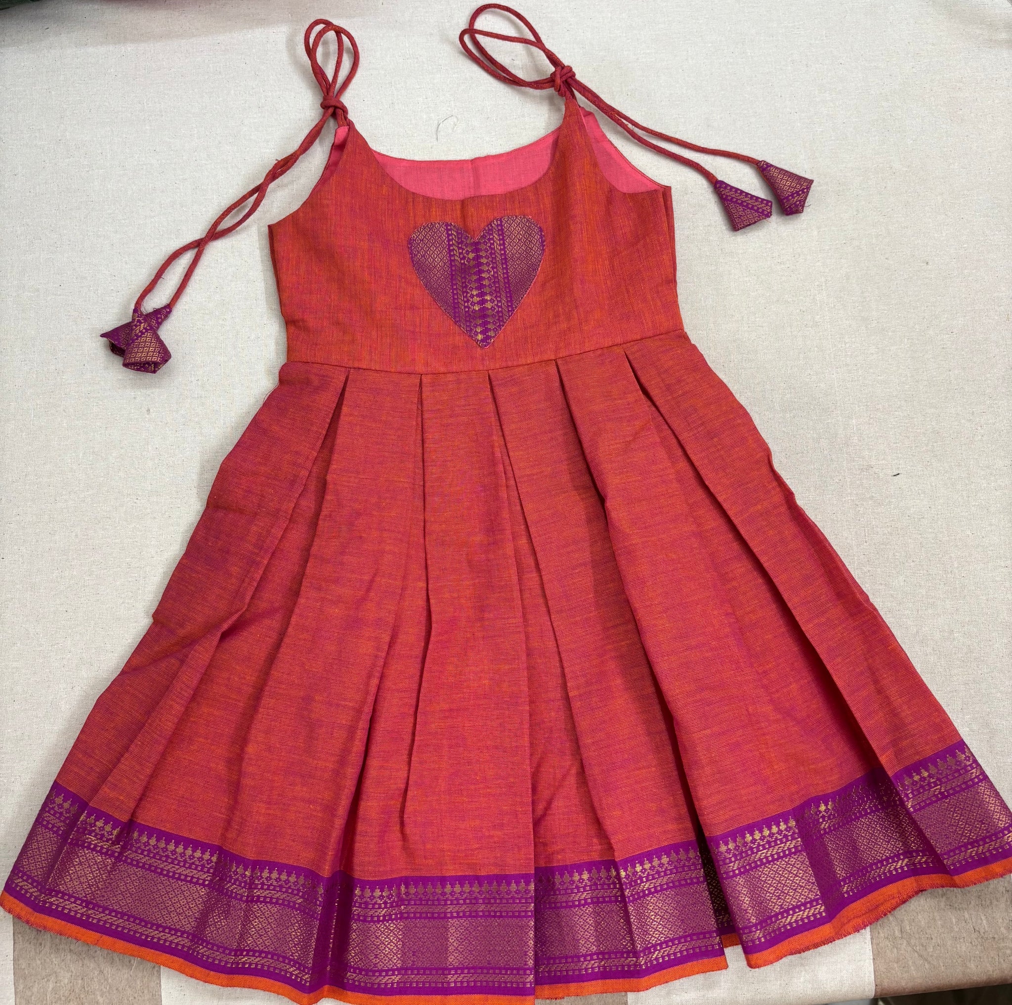 This Peach Mangalagiri frock features a tie-up design and box pleats for a comfortable fit.