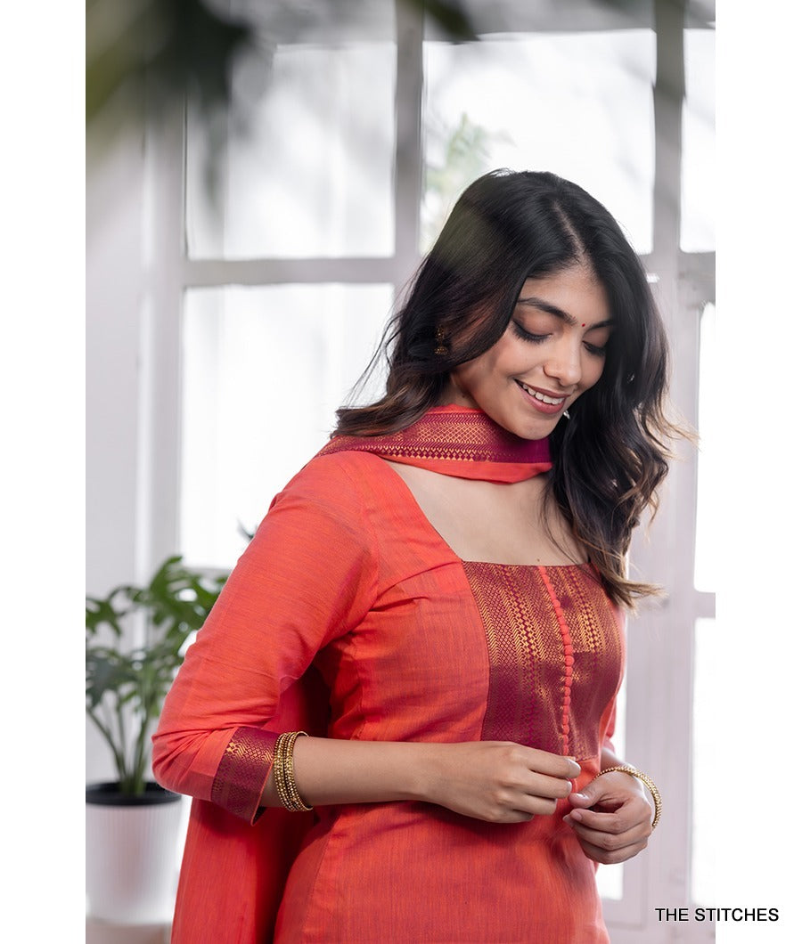 The Mangalagiri Kurti & Dupatta Set in peach features a classic kurti with a matching dupatta that combines traditional charm with everyday comfort.