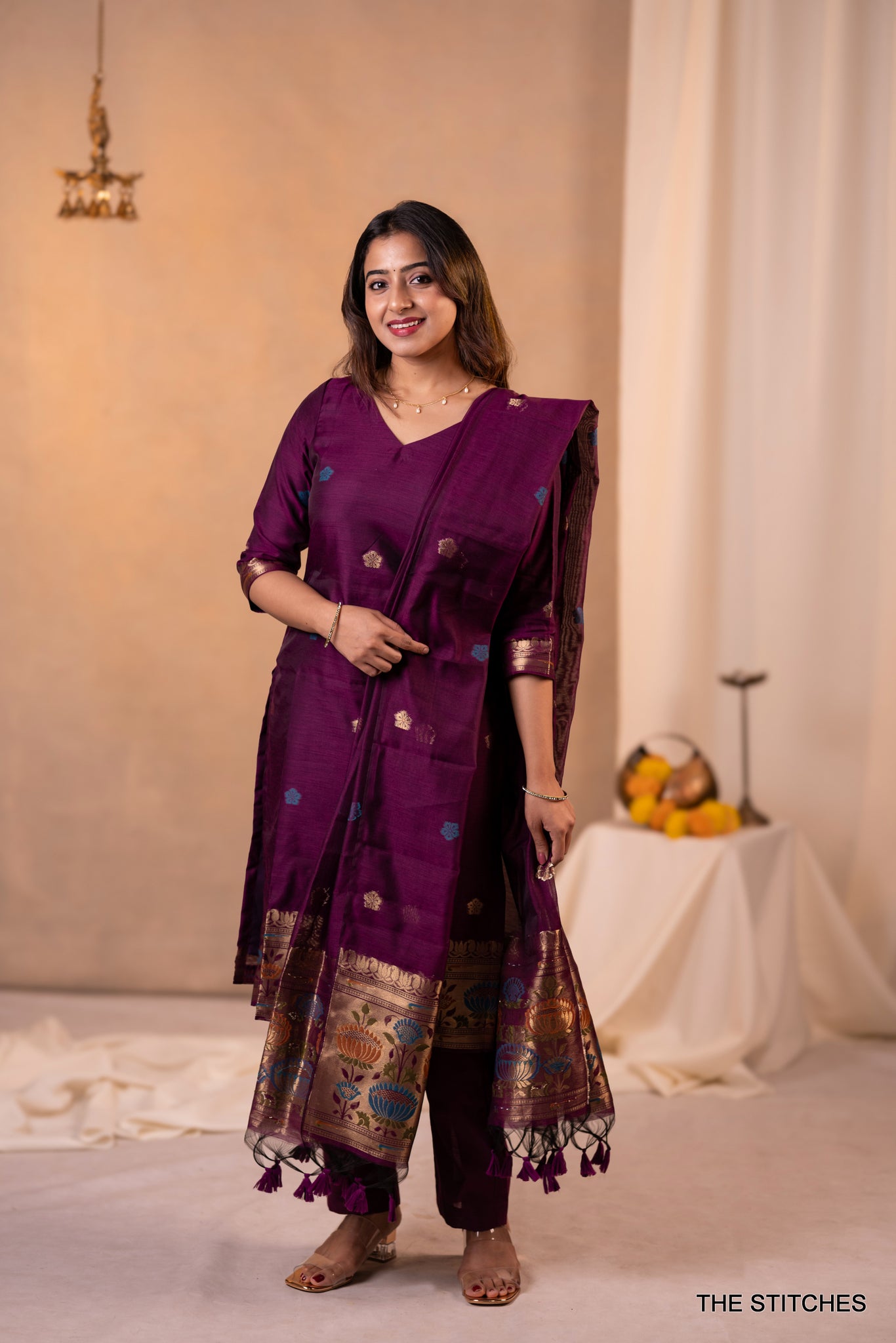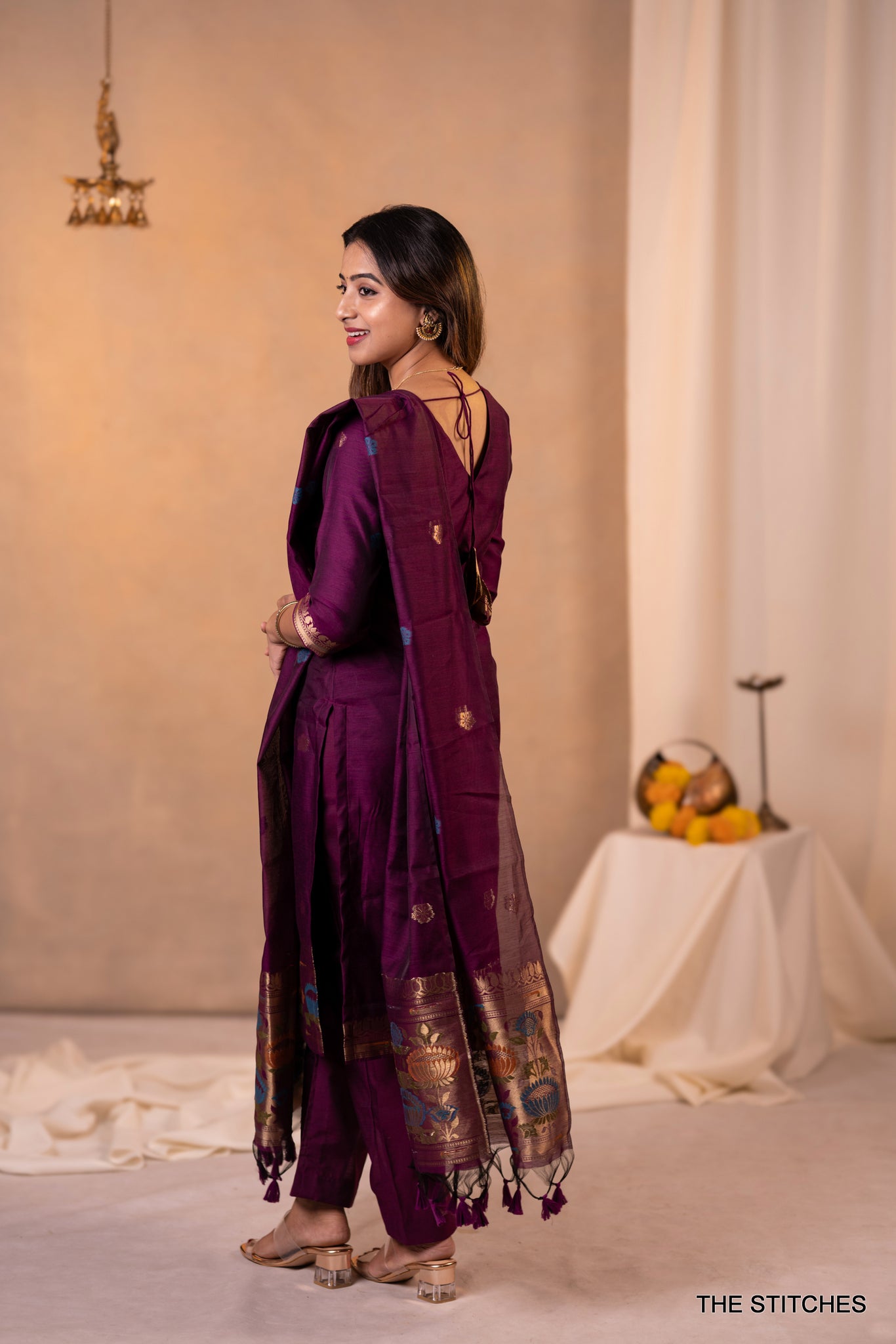 This Amaira Purple Set includes a festive purple kota fabric outfit paired with a matching dupatta.