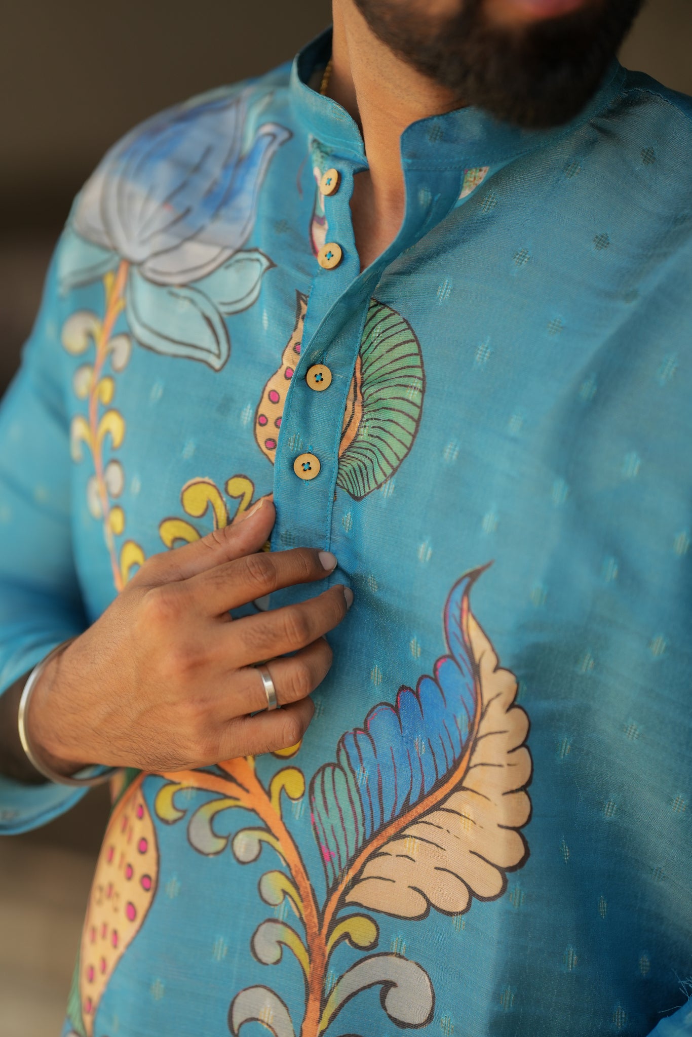 Traditional charm to your wardrobe with our exclusive Blue gold butta Kurta Crafted with floral Hand painted inspired print.