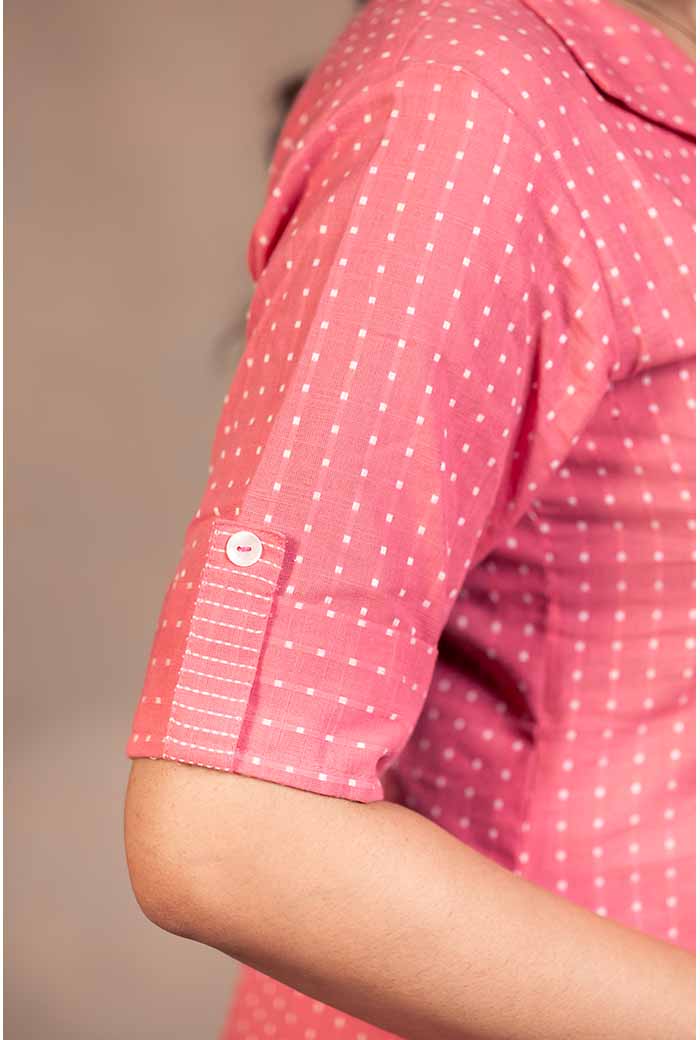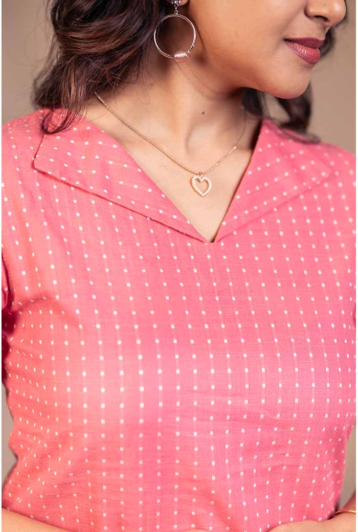 The HANDLOOM - PINK kurti features a three-paneled design, with a cotton handloom straight pants for a stylish and elegant look.