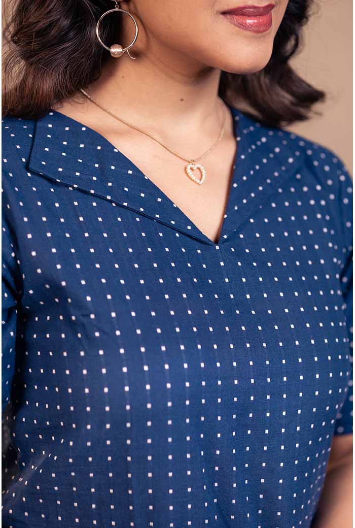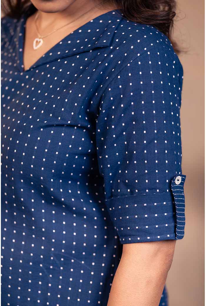 The HANDLOOM - BLUE kurti features a three-paneled design, with a cotton handloom straight pants for a stylish and elegant look.