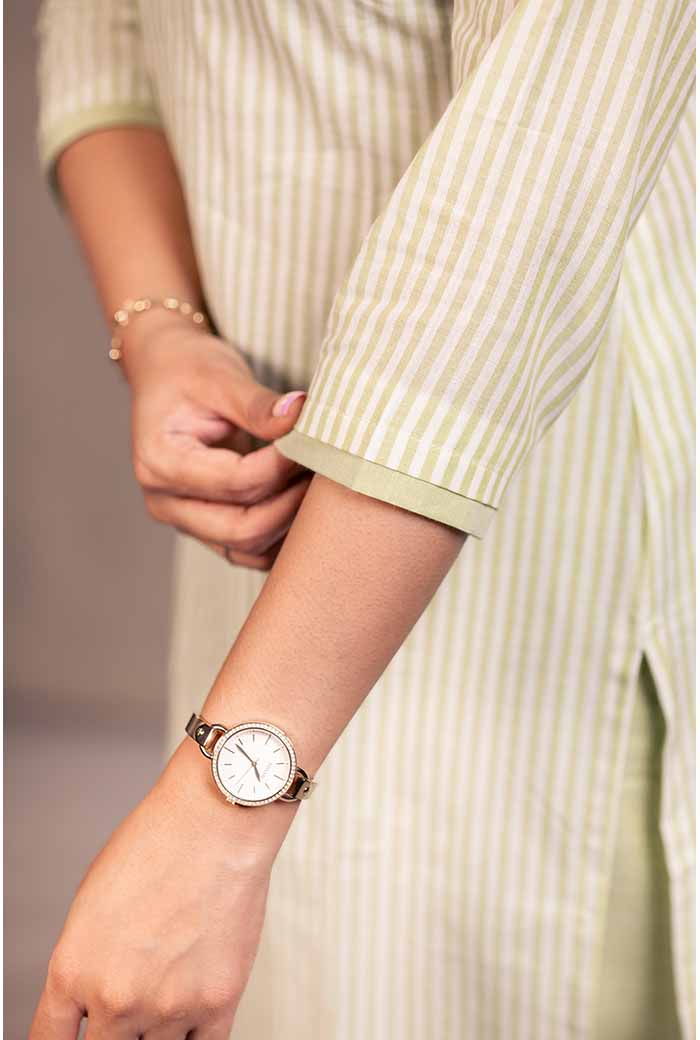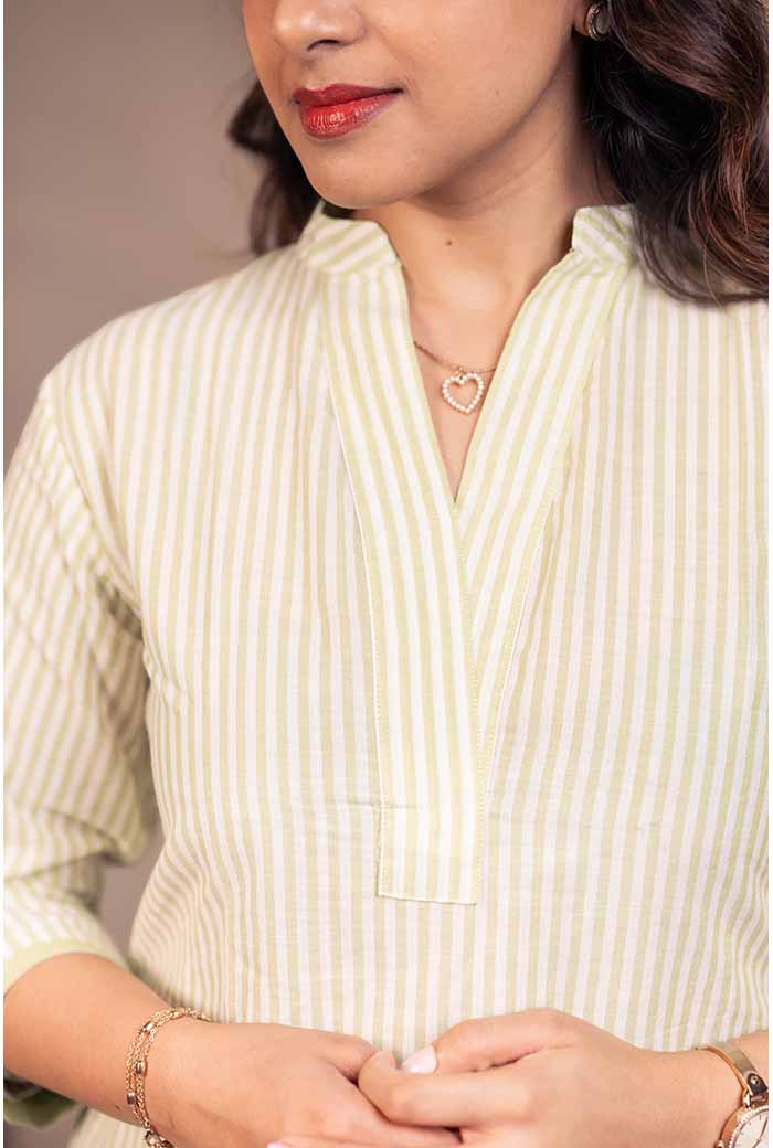 The HANDLOOM - WHITE & GREEN kurti features a three-paneled design, with a cotton handloom straight pants for a stylish and elegant look.
