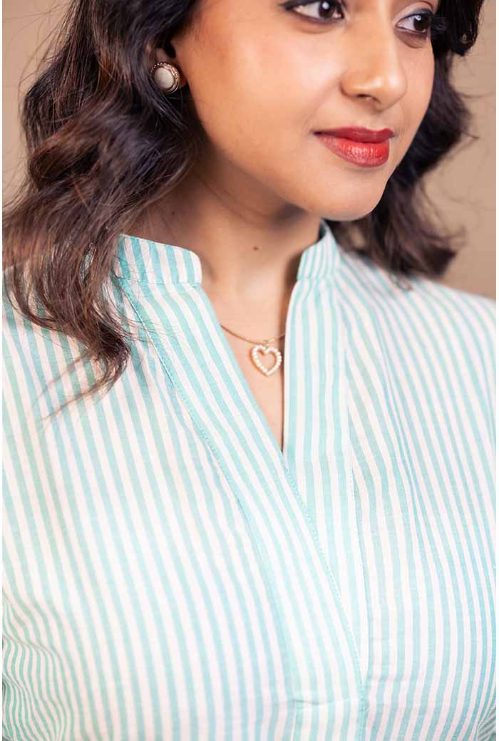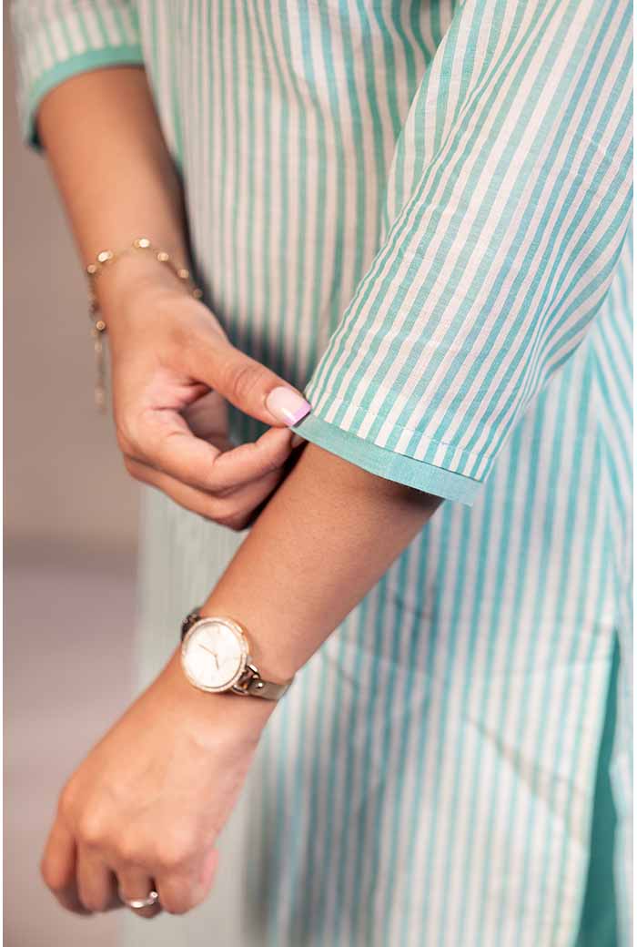 The HANDLOOM - WHITE & BLUE kurti features a three-paneled design, with a cotton handloom straight pants for a stylish and elegant look.